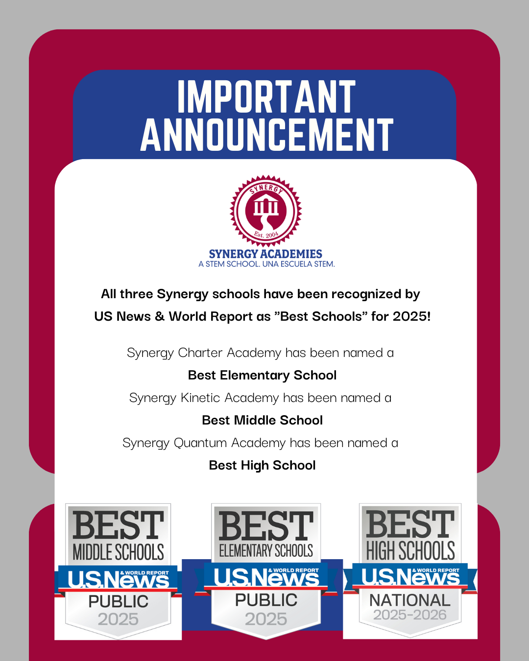 All three Synergy schools have been recognized by the U.S. News & World Report as Best Schools for 2025: